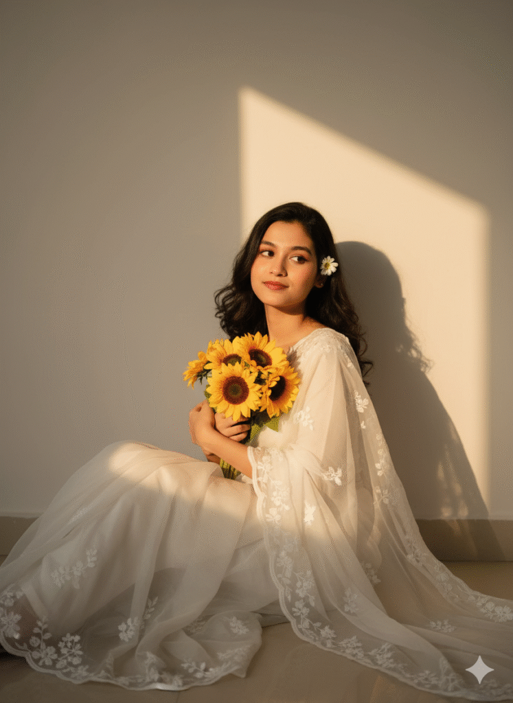 “”Create A soft, sunlit portrait of My self [Uploaded Face] wearing a flowing sheer yellow saree with delicate floral embroidery. She sits gracefully against a plain wall, bathed in warm natural light with a triangular patch of sunlight casting artistic shadows. She holds a vibrant bouquet of sunflowers close to her chest, and a small white flower is tucked behind her ear. Her gentle expression, loose hair strands moving slightly, and the dreamy golden glow create a serene, poetic, and romantic,her face should match 100 % with uploaded refference.””