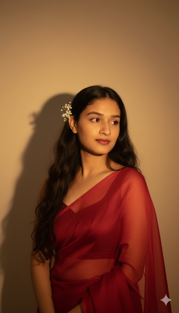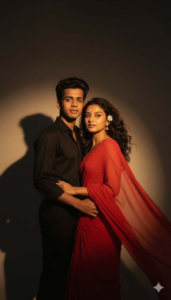 “”He will be holding my saree pallu in his hand, dressed in a retro style with a black shirt, carrying a Dev Anand-inspired look. I will be in a perfect plain chiffon saree, red in color, giving a Pinteresty aesthetic retro vibe. Think of a 90s movie feel – dark brown wavy curly hair with a small flower tucked visibly into the curls, romanticizing in a windy environment. I’ll be standing against a solid wall with deep shadows and contrast drama, creating a mysterious and artistic atmosphere. The lighting will be warm with golden tones, evoking a sunset or golden hour glow. The background will stay minimalistic and slightly textured, while my expression will be moody, calm, yet happy and introspective.””